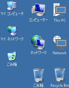 MSXのような色数のデスクトップアイコン(左からWinXP、Win7、Win10)。